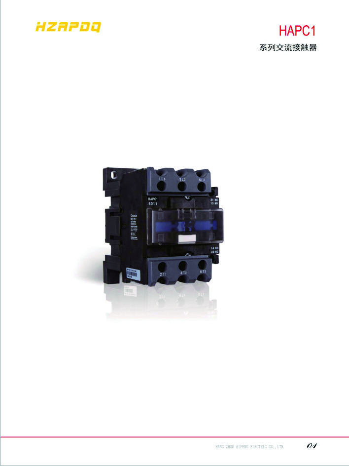 HAPC1(Z、ZE)-09~95系列交流接觸器(以下簡稱接觸器),主要用于交流50Hz(或60Hz),額定絕緣電壓為1000V,在AC-3使用類別下額定工作電壓為415V時額定工作電流為9A~95A的電路中,供遠距離接通與分析電路及頻繁起動、控制交流電動機:并可與適當?shù)臒徇^載繼電器組成電磁起動器,以保護可能發(fā)生過負荷的電路。
